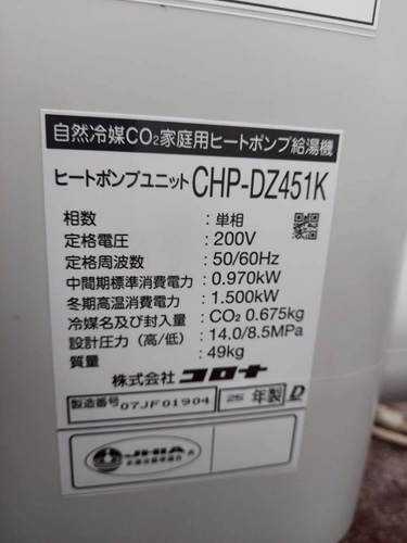 柏市旭町 コロナ自然冷媒CO2家庭用ヒートポンプ給湯機ヒートポンプユニットCHP-DZ451K、貯湯ユニットCTU-37AZ1K エコキュート交換工事